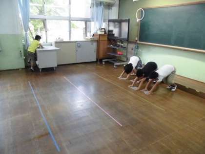 2つのグループに分かれて掃除をしています。それぞれ,ほうき係と下雑巾,上雑巾係に分かれて教室をきれいにします。みんな一生懸命掃除し,教室はピカピカです。教室がきれいになると,気持ちがいいね!勉強も頑張れます!!