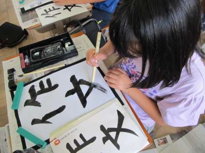 書写の学習では,「作文」という文字を毛筆で書きました。「文」の最後のはらいが上手くいくように,筆の筆圧を気にしながら,丁寧に書くことができました。