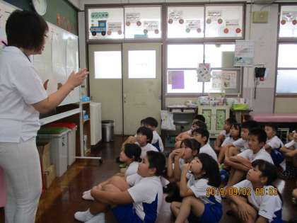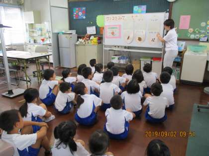 身体計測がありました。計測の前に自分の体調を知るためには便を見ることが大切という話を養護の斎藤先生にしていただきました。はじめは不思議そうな顔をしていた子どもたちも,その日の体のバロメーターになるという話では大きくうなずく姿が見られました。その後,身長と体重を測り,4月からどれだけ身長が伸びたか,体重が増えたのかをわくわくした表情で聞いていました。