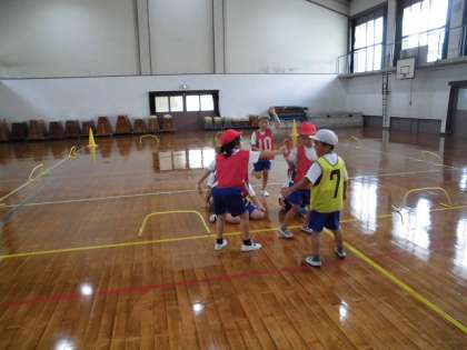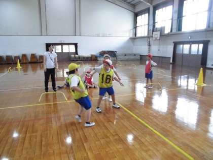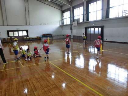 大空の2・3年生で2つのグループに分かれ,リレーをしました。バトンをもらって一周走って,次の人にバトンを渡します。はじめは,相手のチームの友達にバトンを渡そうとしたりバトンをもらっても走り出さなかったりしていましたが,繰り返しリレーをするうちに,自分のチームを意識し,バトンの受け渡しもスムーズになってきました。一人で走るよりも力強く走る子もいて,みんなで走る楽しさを感じているようです。