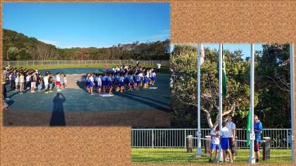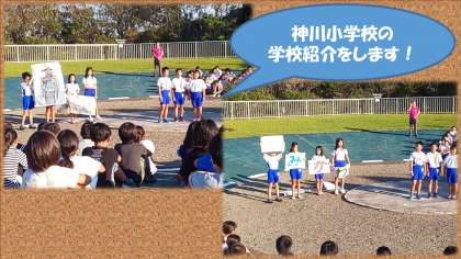 朝の集いでは,校歌を歌い,明親小学校の後に神川小学校の学校紹介をしました。半鐘や釣り船のことを紹介しました。