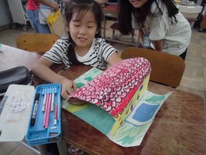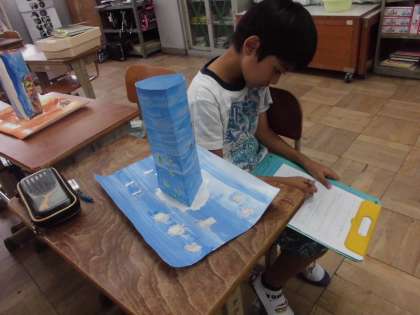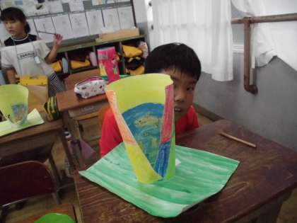 今月から取り組んできた「立ち上がった絵の世界」の作品が完成しました。立てた紙から思い浮かんだことを絵にする活動に,子どもたちは意欲的でした。友達と作品を鑑賞し合い,それぞれの作品の良いところを見つける活動をしました。