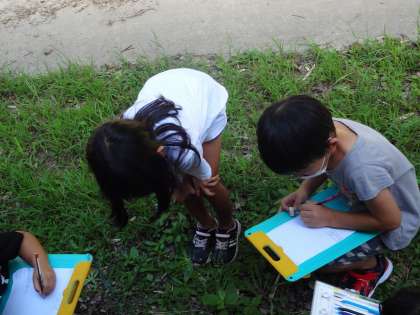 理科では「動物のすみか」の学習をしています。今日は,昆虫などの動物がどんな場所にいて,どのようなことをしているのかを調べました。「運動場の隅の桜の木の下に穴がいっぱいあるよ!」「アリの巣がある!食べ物を運んでいるよ!」と子どもたちは興味津々で,調べていました。