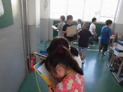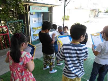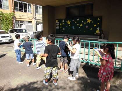 掲示委員会が企画したウォークラリーをしました。お月様を探してその中に書いてある文字をシートに書き写します。みんな「お月様はどこ?」と探し,見つけると「ここにあった!」と大喜びで書かれた文字をシートに書き込んでいました。
