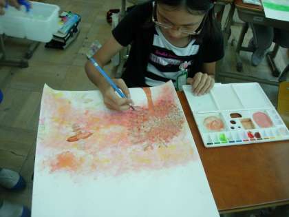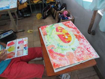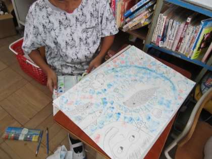 図画工作科では,お話をきいて絵に表しています。それぞれのクラスがお話からイメージした場面や姿,表情を思い思いに描いています。