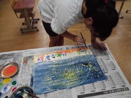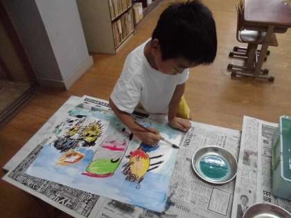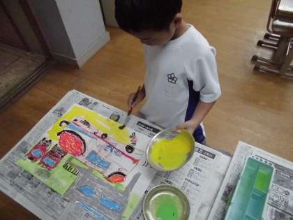 お話の絵の背景を絵の具で塗りました。クレヨンで描いた登場人物や物が,絵の具で消えてしまわないように,周りを塗ったり水加減を調節したりしながら塗っていきました。お話の様子が思い浮かぶようなすてきな絵に仕上がりました。