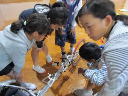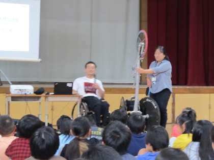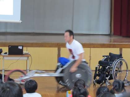 また,普段使っている車いすだけでなく,マラソンで使われている競技用の車いすも持ってきていただき,実際に体育館の中を走ってくださいました。子どもたちは車いすから車いすに乗りかえる様子やスピードの出る競技用車いすに驚いていました。