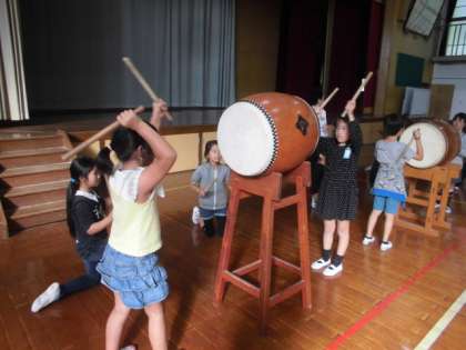 総合的な学習の時間に,地域に伝わる「祭」について学習しています。今まで大切にされていきた千種祭を今度は自分たちが受け継いでこうと,子ども達は祭の中で歌われる千種囃子に挑戦しました。地域のお師匠さんに教えてもらって,歌を歌ったり,和太鼓で演奏したりしました。最初は,なかなかリズムが上手くとれない子もいましたが,どの子も一生懸命に取り組み,少しずつ上手に太鼓を叩くことができるようになっていました。