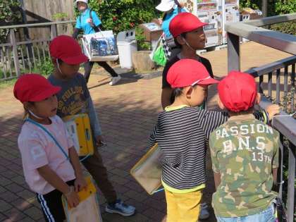 動物園に着き,クイズラリーをして歩く子どもたち。