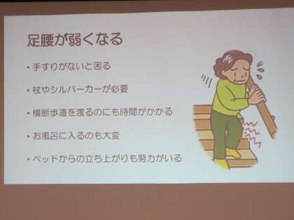 高齢者と呼ばれるのは65歳からで,高齢者といっても,元気な高齢者もたくさんおられることを分かりやすい例を挙げて説明していただきました。その上で,年をとると,どんなことに困るのかという話をしていただきました。