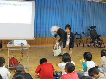 そこで,もし,道で高齢者の方に出会ったらどうするかという設定で,実際に何人かに演技をしてもらい,みんなでどう声を掛けるのがいいのか,どんなふうに振るまえばいいのか考えました。