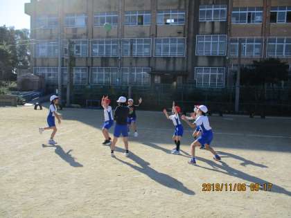 体育の学習でエンドボールをしています。相手チームにボールをとられないように,味方にうまくパスをつなぐにはどうすればよいのか考えて動く様子が見られます。だんだんと試合も白熱し,「相手と反対に動こう!!」「ナイスパス!いいよ!」たくさんの声が飛び交います。試合が終わった後の子どもたちは,すがすがしい顔をして握手を交わしていました。