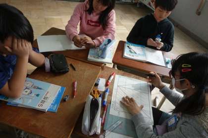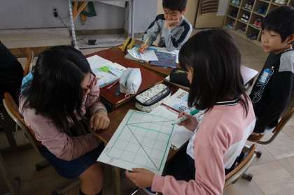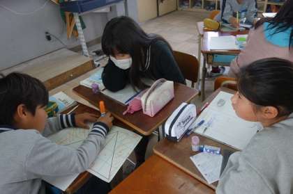 算数では,三角形の面積を求める学習をしています。これまでの学習を生かして,三角形の面積の求め方を班のみんなと話し合いました。「ここに線を引いて・・・」「こことここが合同だから・・・」と上手に説明ができるようになってきました。難しい問題もみんなと取り組むからこそ,できるようになりますね。