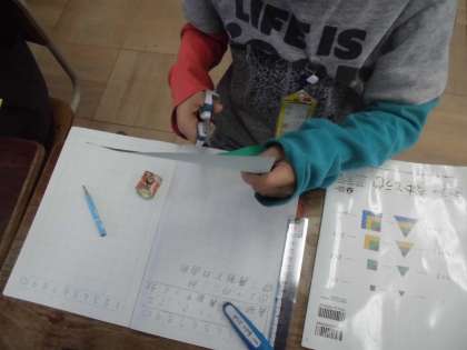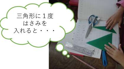 今日は,三角形の折り紙に1度,はさみを入れるとどんな形ができるかを考えました。その後には,2度,はさみを入れるとどんな形ができるかについても考えました。