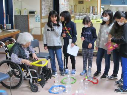 交流会当日は,遊びのグループに分かれて,お年寄りの方に丁寧に説明して進めていました。