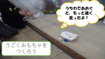 ゴムで弾いて跳ぶおもちゃや自動車のようにタイヤで前に進むおもちゃ,ヨットのように風の力で進むおもちゃ等,たくさんの種類があります。