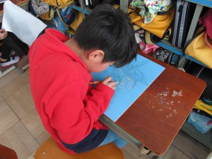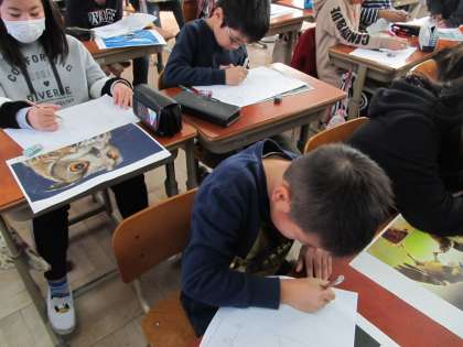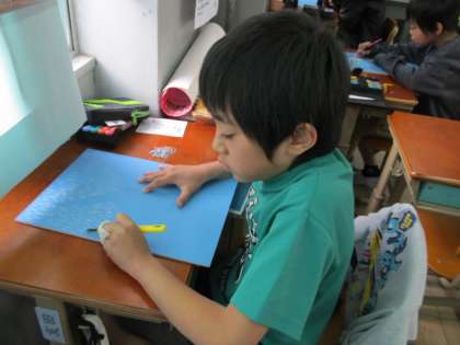 図画工作科の学習では,初めての木版画をしています。板に下絵を写し,彫刻刀で彫っています。子どもたちは丸刀,小丸刀,三角刀の3種類から自分の絵にあう彫刻刀を選んで慎重に彫り進めています。