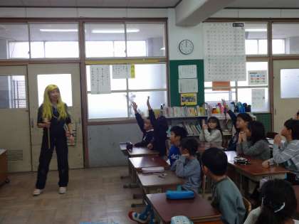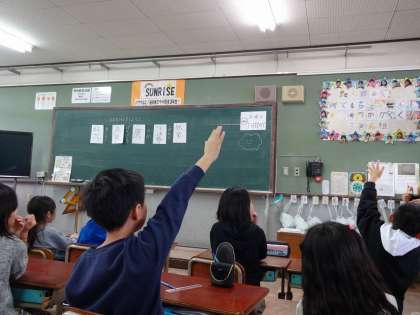 今日は,外国語活動で「お正月クイズ」をしました。子ども達は興味津々で「What's this?」「Hint please?」とたくさんやり取りをしていました。最後には,福笑いを作り,「It's mouse.」と友達に顔のパーツを渡して,みんなで楽しみました。