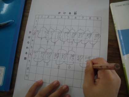 九九の表の空いた箇所に答えを書き入れていると,「あ,3の段は答えが3ずつ増えている!」「かける数が1増えると,かけられる数だけ答えが増えるね。」といったたくさんの気付きの声が聞こえてきます。また,「2学期よりもかけ算の答えを出すのが速くなった気がするなぁ。」と,自身の成長に気付き,驚いている人もいます。