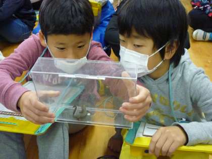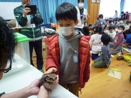 最後に希望者のみ,ヒキガエルに触らせてもらいました。めったに見ることのできないかえるを見て,子どもたちは驚いていました。