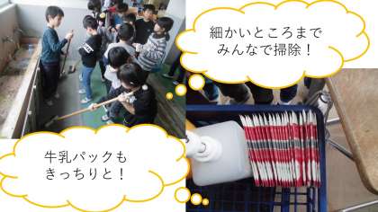 「そうや!普段,掃除できていない場所も掃除しよう!」「あ,牛乳パックもちゃんと畳もうね!」「あ,道徳であいさつの大切さについて勉強したから,きちんとあいさつしよう!」と,友だち同士で声を掛け合う姿が見られ,大変こころが温かくなりました。