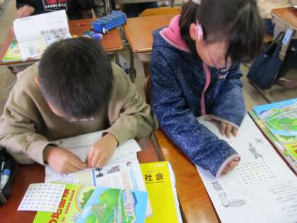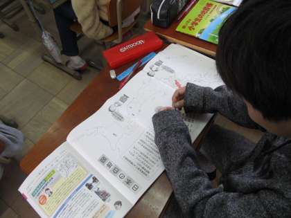 社会では,わたしたちの住む京都府について調べています。京都府の位置を確認したり,どの県ととなり合わせになっているのかなどを学んだりしています。47都道府県をどのくらい覚えているのか,シールを貼りながら確認もしました。