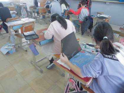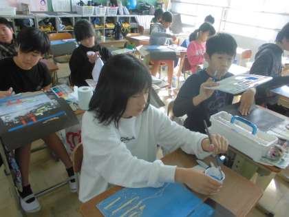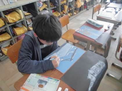 彫刻刀で彫るのが終わった子たちは,色付けを始めました。今回は,初めての一版多色刷りに挑戦しています。何度も色を重ねながら頑張っています。