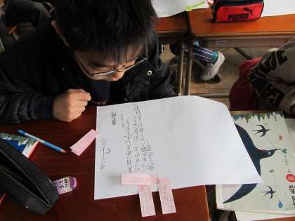 国語科では,工藤直子さんの「のはらうた」を読み,自分たちでオリジナルの詩を考えています。タイトルや名前にもこだわり,調子をつけたり,きらりと光る言葉を考えたり,子どもたちなりに工夫しています。作った詩をみんなで読み合い,「自分だったらこうする」をアドバイスとして書きました。これからもっと素敵な詩にしていきたいです。