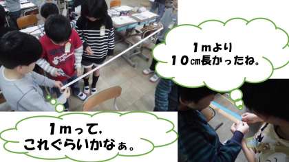 自分が1mだと,思った部分でテープを切り,1m定規で測ってみると思ったより短かったり,長かったりして,結果に驚いていました。