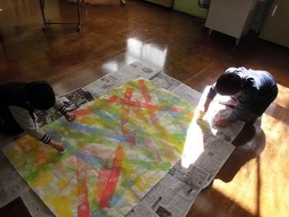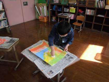 図工の紙版画で鬼を作り,それを貼る背景の仕上げをしました。前回の授業でローラーを使ってコロコロと色をつけ,その上からタンポで色をつけて豆を表現しました。ポンポンと押す感覚を楽しむ子や,どこに押そうかと考えながらつけている子など,みんな思い思いの背景を仕上げていました。
