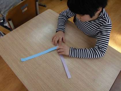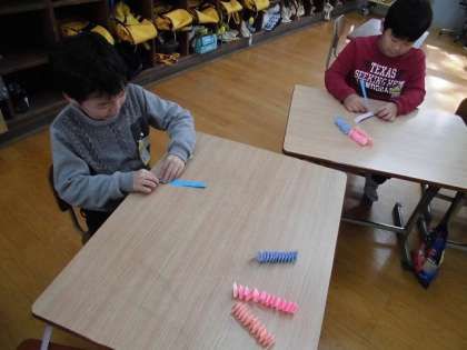 小さな巨匠展の立体作品につける腕や足を,細長い色画用紙を織り込んで作りました。はじめは手こずっていた子どもたちも,繰り返し織り込んでいくうちに,一人で最後まで折れるようになってきました。紙を貼ったり折ったり,粘土をこねて丸めたりと,体のパーツを一つずつ作っています。