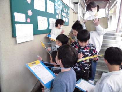 飼育委員会が企画したクイズラリーをしました。全8問のクイズを探して解答用紙に書きます。「ウサギのシロはいつからいるの?」「ウサギの耳の役割は?」となかなか難しい問題で,子どもたちも相談しながら解いていました。校内を歩き回り,8問中7問までは見つけられたのですが,1問だけ見つけられず,今回はタイムアップ。また,探しに行こうと思います。