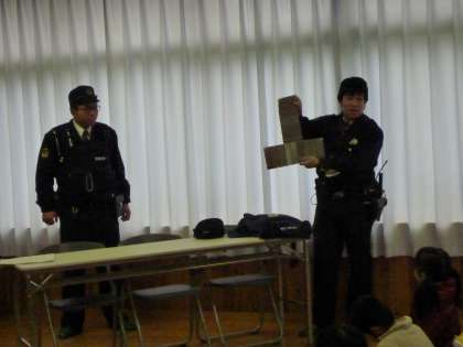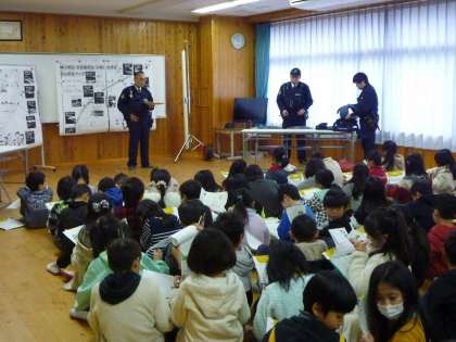 社会科「事故や事件からくらしを守る」の学習で,久我交番でお勤めされている警察官の方にお越しいただき,警察官の仕事や事故・事件が起こりやすい場所等について詳しく話を聞きました。事故にあわないために,3年生の自分たちにもできることについてもお話しいただきました。