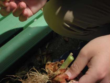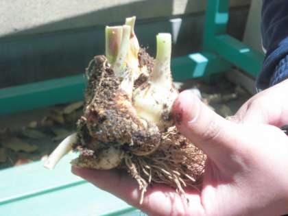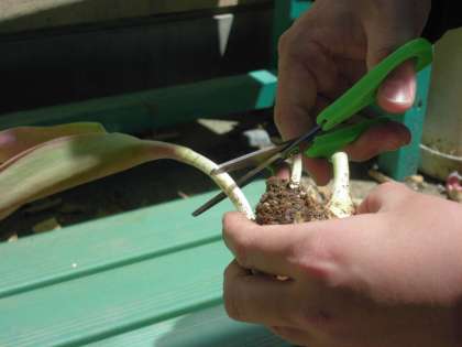 ぬいたきゅうこんの,くきのぶぶんをきります。