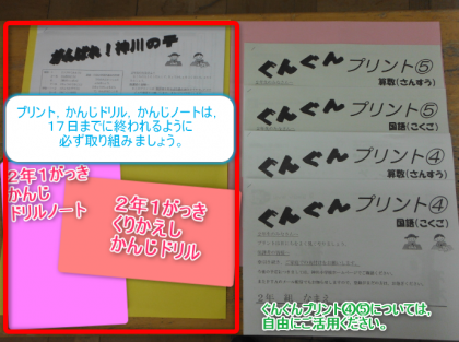 休校期間中の課題については,「がんばれ!神川の子」学習プリントと漢字ドリル,漢字ドリルノートを17日までに必ず取り組みましょう。
