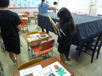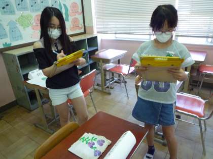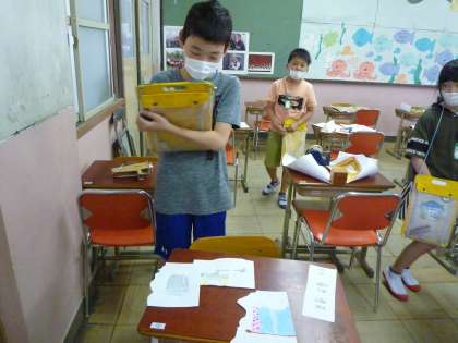 休校中に子どもたちがお家で作った図画工作科の作品を音楽室に飾り,5年生みんなで鑑賞会をしました。クラスごとに交代で音楽室に入り,作品を鑑賞しながら,よかったところを鑑賞カードに書いていきました。それぞれが友達の作品の良いところをしっかり見つけている様子でした。