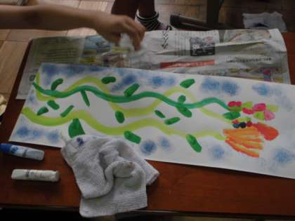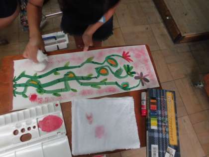 咲いている場所を想像しながら,背景を描き,友達の作品を見て「すごい!」「こんな花があったらいいのになぁ」と,教室にはまぼろしの花が咲きほこっていました。