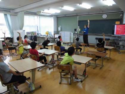 その後,「What's this?」のクイズをしました。食べ物や動物の