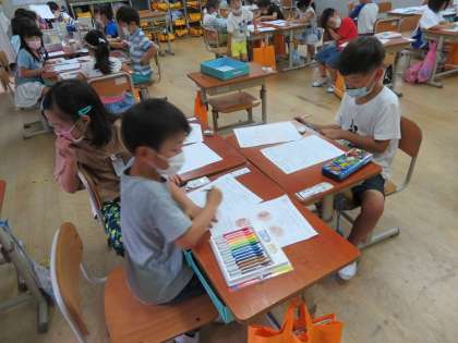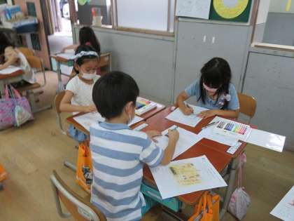 2年生と一緒に学校探検に行った1年生。
