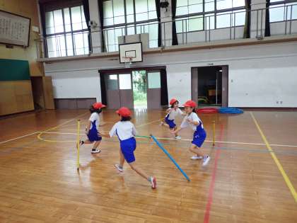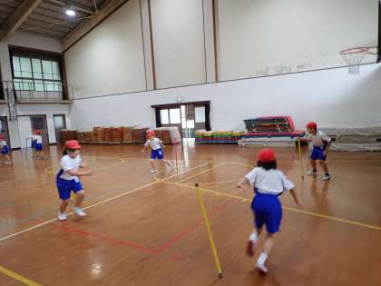 今回は,棒を立てて,隣の人の棒が倒れる前にキャッチするという遊びをしました。子どもたちはグループの全員が隣の人の棒を取れたら少し輪を広くして,長い距離に挑戦していました。