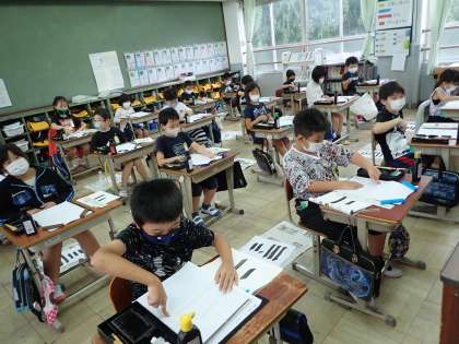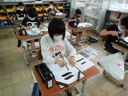 いよいよ待ちに待った初めての毛筆の授業。子どもたちはすずり,筆,墨汁など,習字の道具に興味津々です。