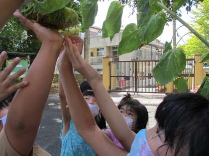 理科では,みんなでヒマワリやホウセンカの様子を観察しに行きました。