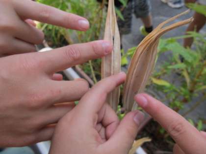子どもたちは,ヒマワリの様子を見て,「なんか中に黄色いつぶつぶみたいなのがある!」「これは全部種??」