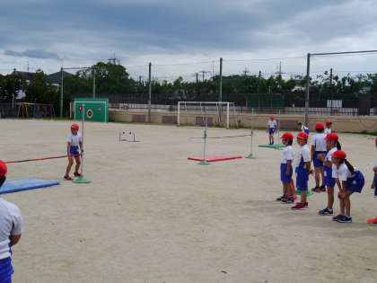 踏切までの歩数や足のあげ方など思ったように体が動かないことに気付きながら,新しい体の動かし方を見つけていきます。ヒップホップステップで頑張ります!!