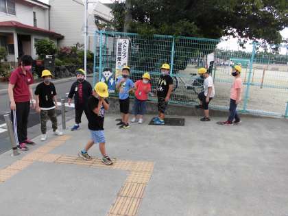 見つけたあと,目をつぶって実際に点字ブロックの上を歩いてみ
