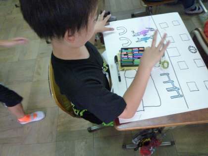 1学期で学習した建物の描き方も思い出しながら描いています。