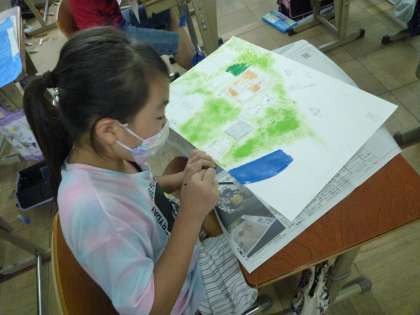 今,5年生は物語を聞いて思い浮かんだことを絵に表す活動をしています。表したい場面に合わせて,スパッタリングなどの様々な技法を取り入れています。