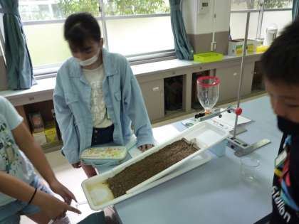 流れる水にはどのようなはたらきがあり,量によってちがいがあるのかどうかを調べるために,土に水を流して実験をしました。水の量を増やした時に砂が大きく動いたり,たくさんの石が下にたまったりしていることに気付いていました。