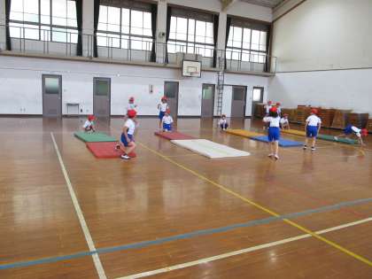 体育のマット運動では,今できる技をより美しくすることと,もう少し頑張ればできそうな技に挑戦することをめあてとして取り組んでいます。