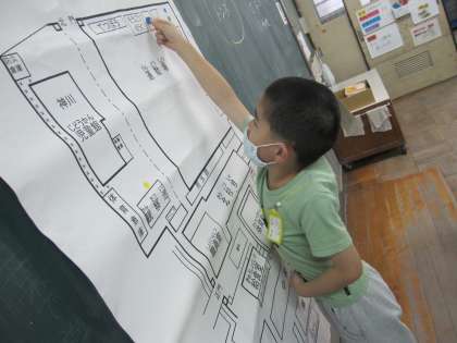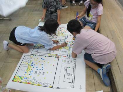 神川小学校にいる生き物は,どこにいたのかということを一目で分かるように,校内地図にシールを貼りました。シールを貼ることで,それぞれの生き物にとってすみやすい場所があることを知りました。